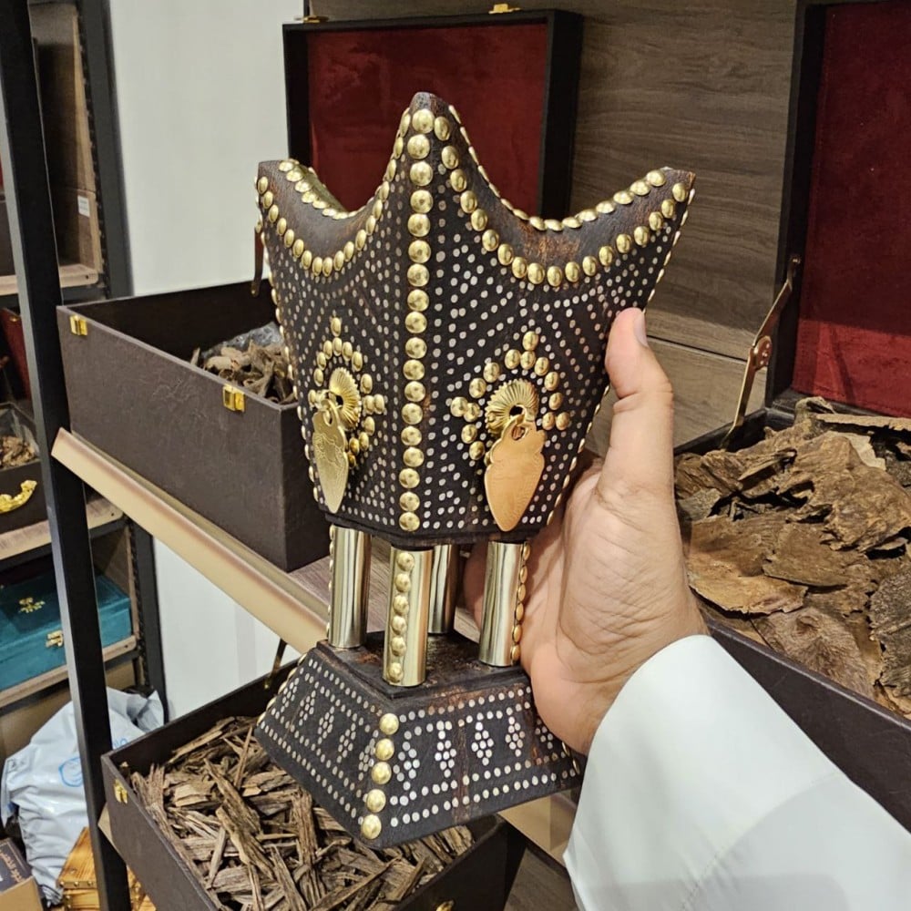 3. المباخر الملكية: تصنع من خشب الأثل الطبيعي الناشف ثم يتم تكسيتها بألواح النحاس أو الألمونيوم . وتتميز بفخامتها وجمال مظهرها مما يجعلها مفضلة للإهداءات والاستخدام الخاص