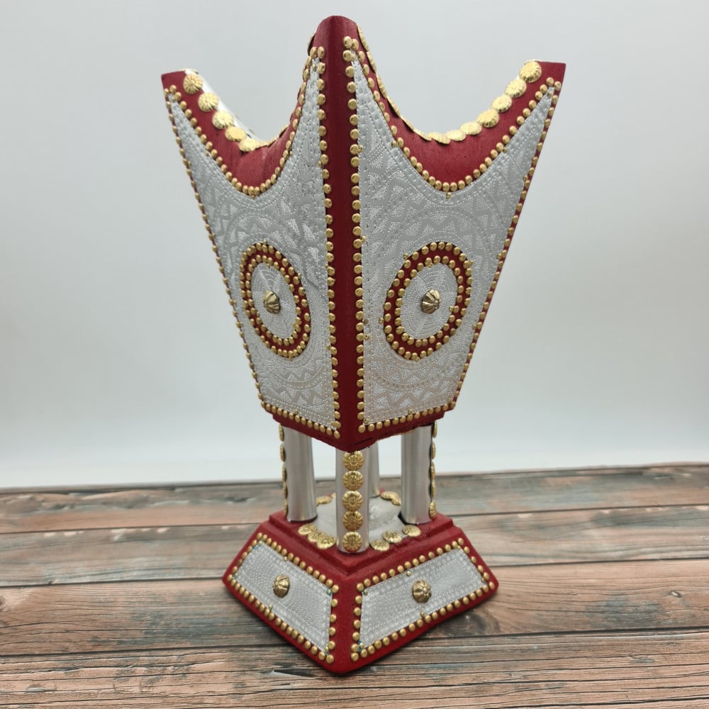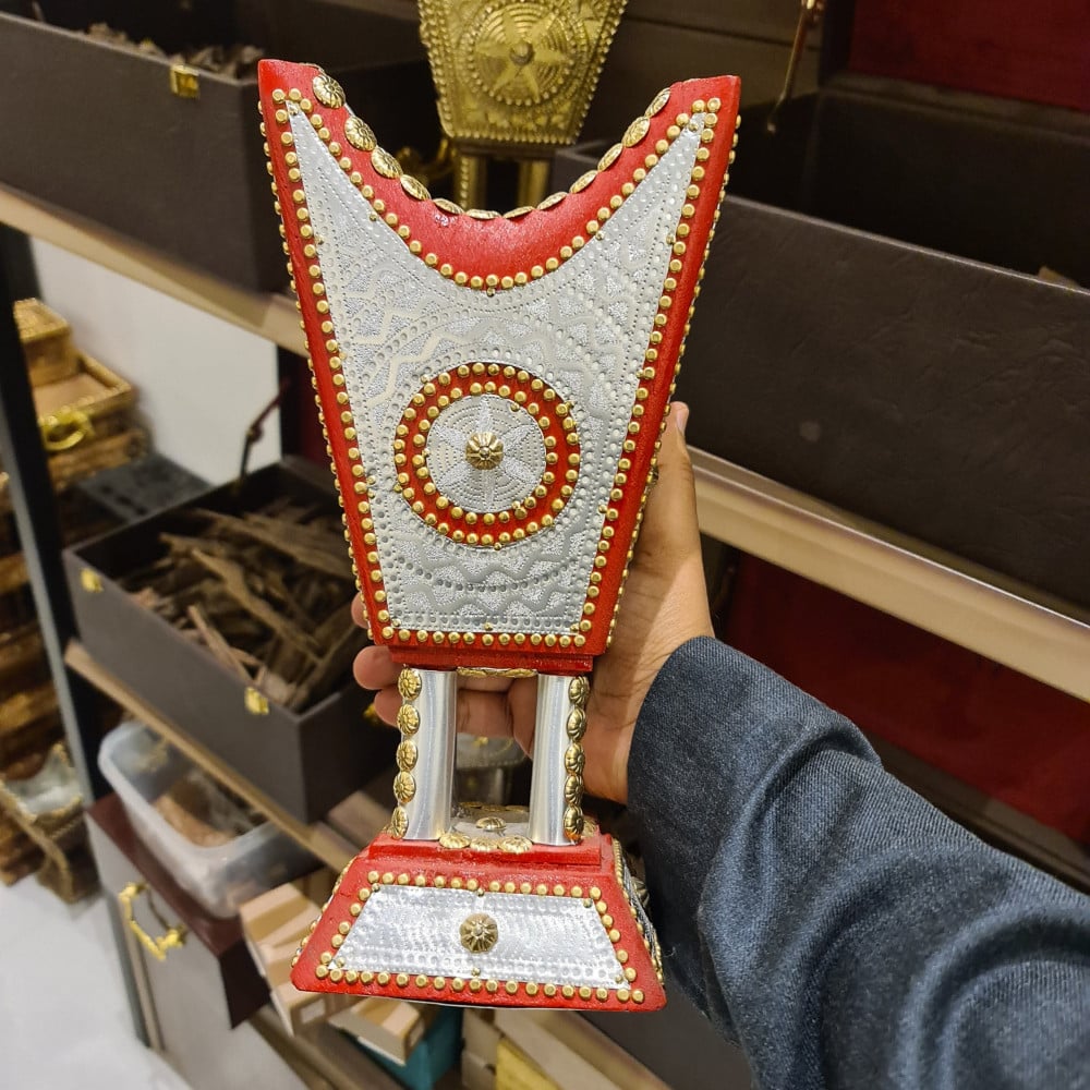 2. المباخر الصاج: تصنع من خشب الأثل الطبيعي الناشف ثم يتم تكسيتها بألواح الصاج الحديد الفضي أو الذهبي. وتتميز بمتانتها وقدرتها على تحمل الحرارة العالية، مما يجعلها مثالية للاستخدام المتكرر.