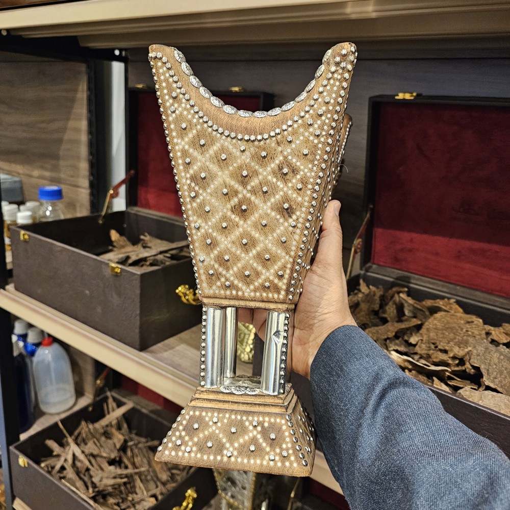 2. المباخر الصاج: تصنع من خشب الأثل الطبيعي الناشف ثم يتم تكسيتها بألواح الصاج الحديد الفضي أو الذهبي. وتتميز بمتانتها وقدرتها على تحمل الحرارة العالية، مما يجعلها مثالية للاستخدام المتكرر.