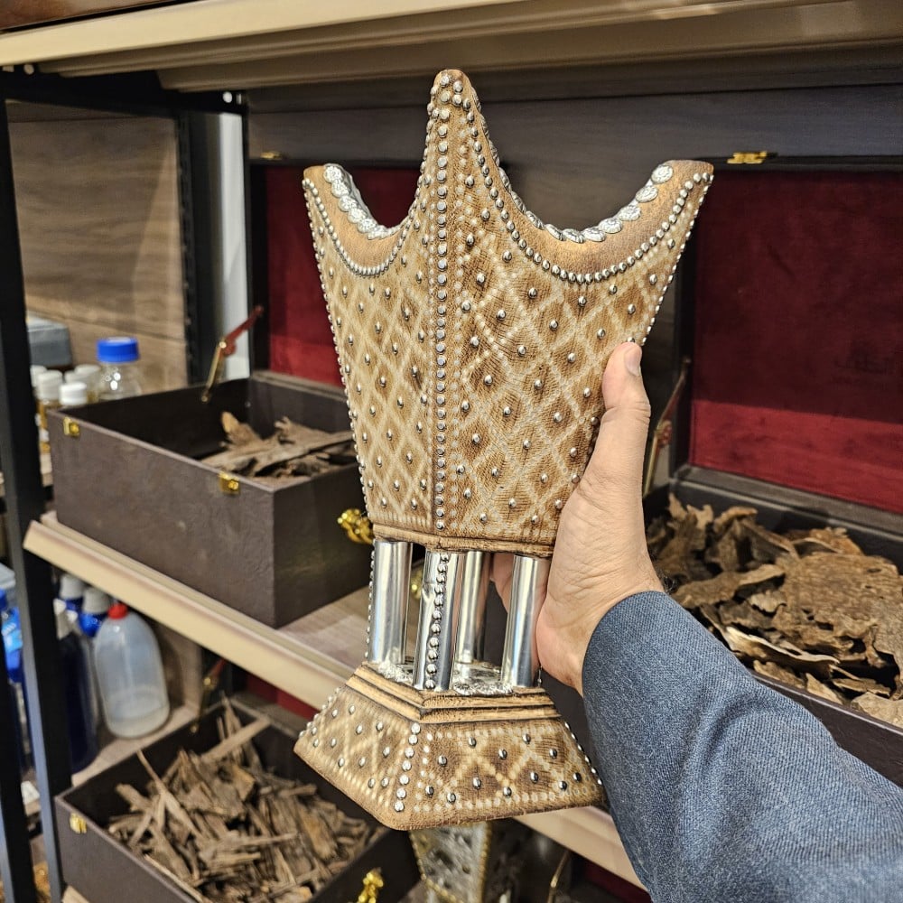 3. المباخر الملكية: تصنع من خشب الأثل الطبيعي الناشف ثم يتم تكسيتها بألواح النحاس أو الألمونيوم . وتتميز بفخامتها وجمال مظهرها مما يجعلها مفضلة للإهداءات والاستخدام الخاص