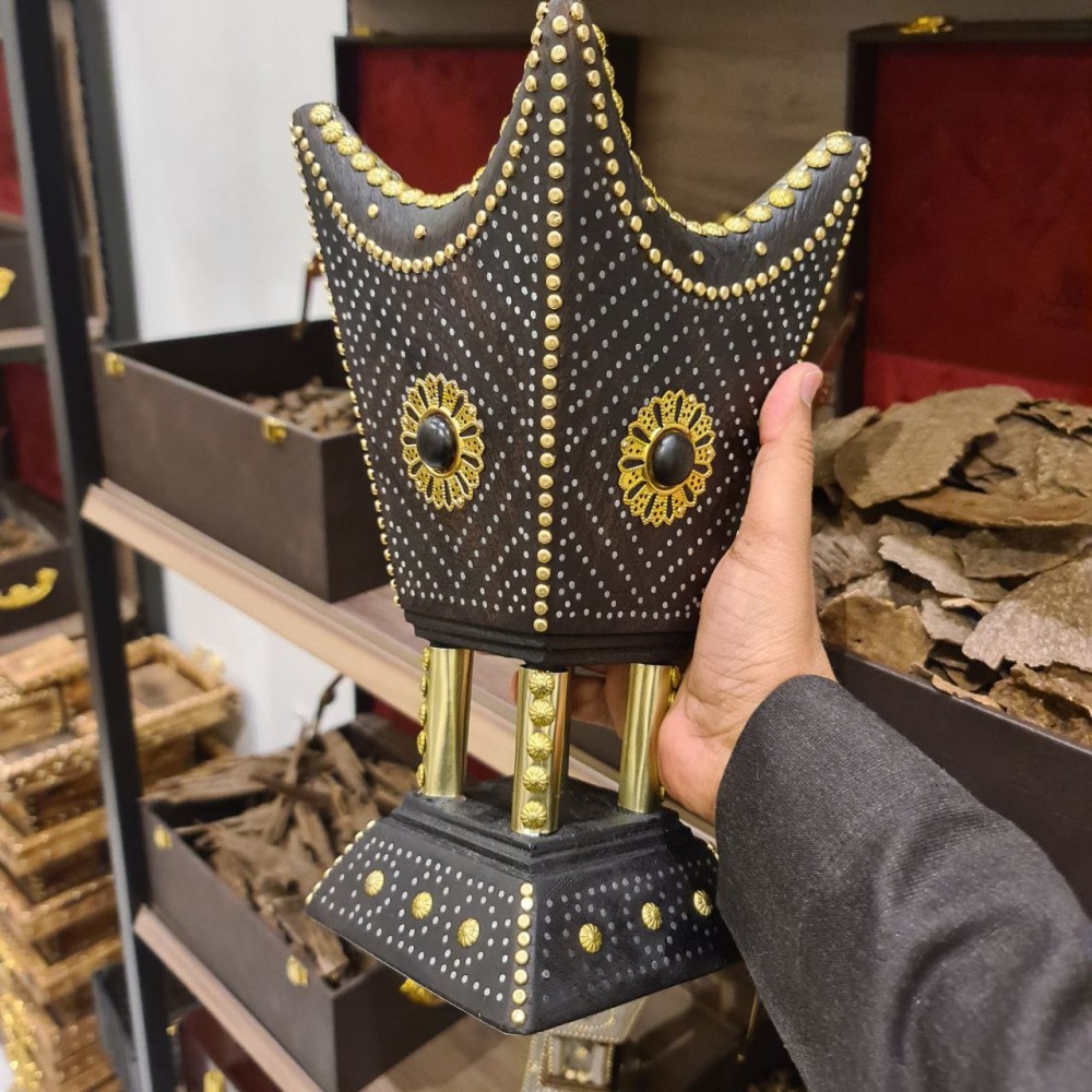 3. المباخر الملكية: تصنع من خشب الأثل الطبيعي الناشف ثم يتم تكسيتها بألواح النحاس أو الألمونيوم . وتتميز بفخامتها وجمال مظهرها مما يجعلها مفضلة للإهداءات والاستخدام الخاص