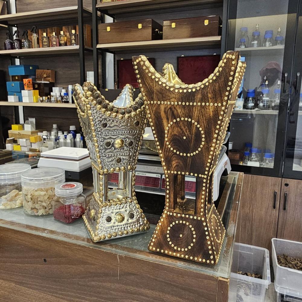 - Carved Burners: Made from natural dry sidr wood, drilled with numerous holes filled with aluminum rods, known as carving, and then sanded and decorated with colors and special nails, making them exquisite pieces of art.